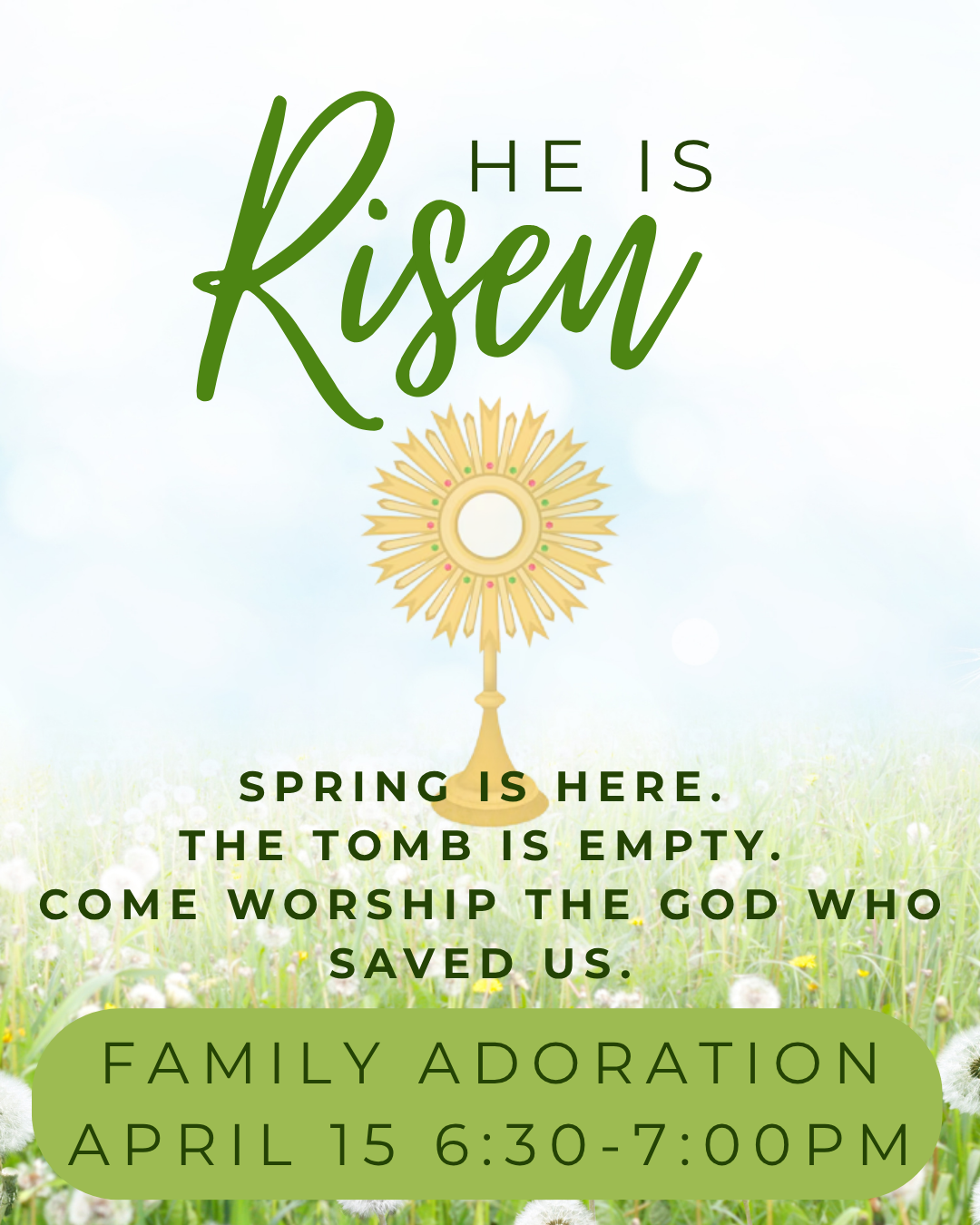 Family-friendly Adoration in the church from 6:30-7:00 pm. Praise and Worship music will be playing during Adoration, and kids are welcome to come sit up by the steps into the Sanctuary so they can get close to Jesus. We are encouraging reverence while acknowledging that they have questions and need to move a little. Let the little children come to me!